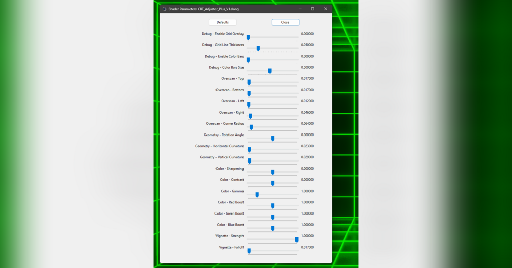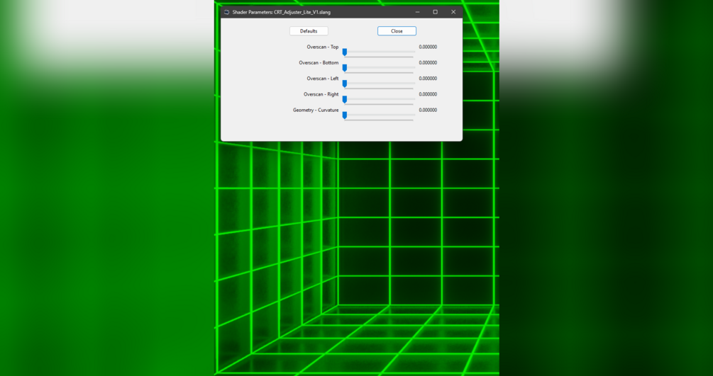 CRT Adjuster is a shader for ShaderGlass designed to provide a safe and accessible solution for screen overscan and positioning issues. It's the perfect alternative when standard display drivers and OS settings fail, you've lost your original CRT remote and cannot access the service menu, or you're not interested in a high-voltage surprise from the deflection yokes. All adjustments are performed as a real-time GLSL filter.